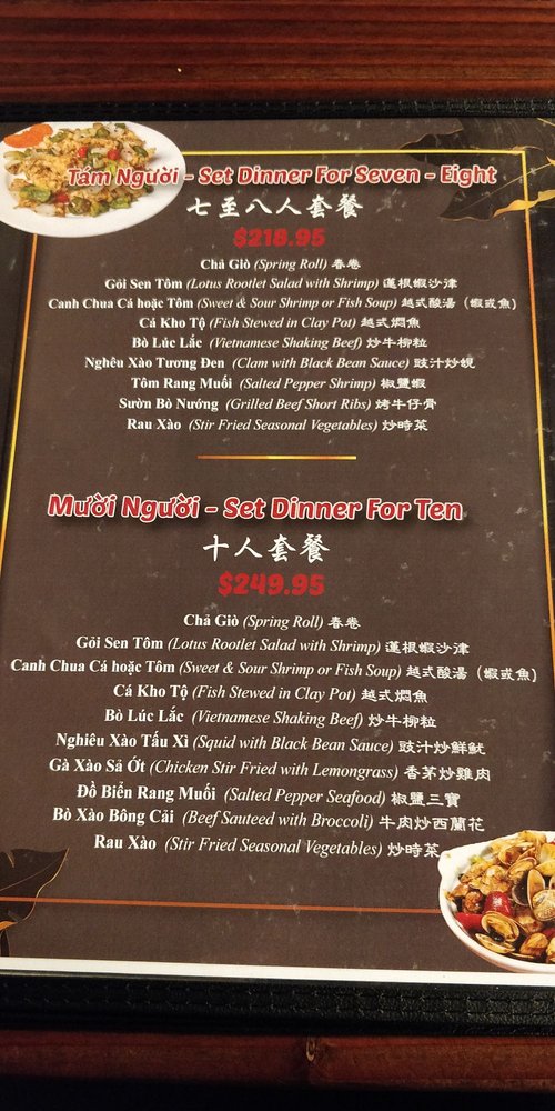 Set dinner for ten. Cha gio, goi sen tom, canh chua ca hoac tom, ca kho to, bo luc lac, ngheu xao tau xi, ga xao sa ot, do bien rang muoi, bo xao bong cai, rau xao. Spring roll, lotus rootlet salad with shrimp, sweet & sour shrimp or fish soup, fish stewed in clay pot, Vietnamese shaking beef, squid with black bean sauce, chicken stir fried with lemongrass, salted pepper seafood, beef sauteed with broccoli, stir fried seasonal vegetables.