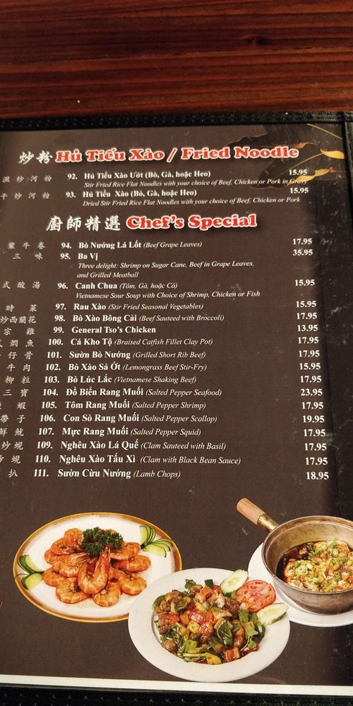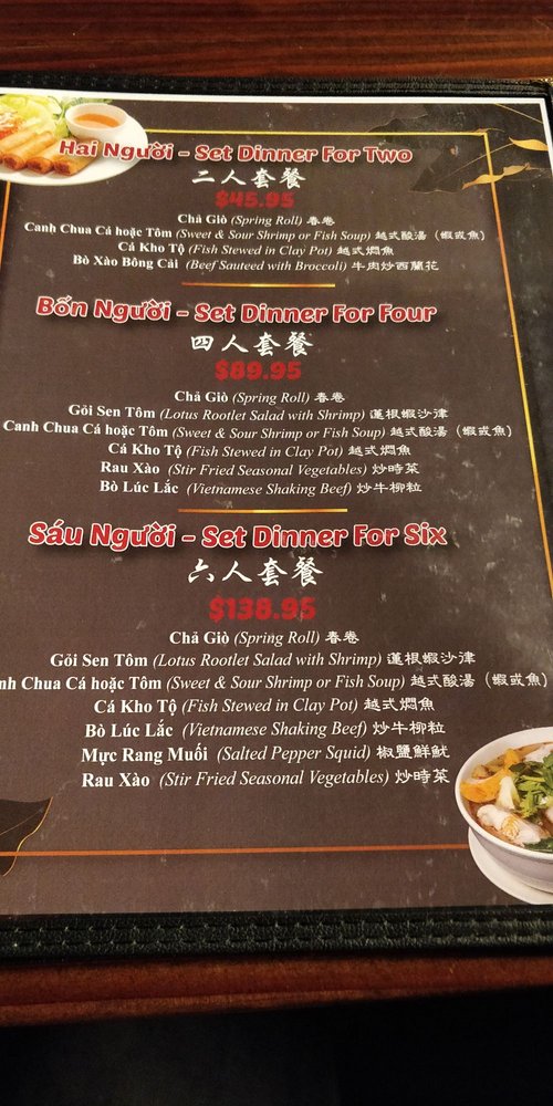 Set dinner for seven-eight. Cha gio, goi sen tom, canh chua ca hoac tom, ca kho to, bo luc lac, ngheu xao tuong den, tom rang muoi, suon bo nuong, rau xao. Spring roll, lotus rootlet salad with shrimp, sweet & sour shrimp or fish soup, fish stewed in clay pot, Vietnamese shaking beef, clam with black bean sauce, salted pepper shrimp, grilled beef short ribs, stir fried seasonal vegetables.